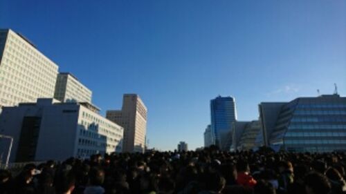 今日も有明へ。昨日に引き続きコミケ3日目に参戦。8時に国際展示場駅に着いたところ東は埋まっており無条件で西に誘導。8時着では出会い橋上。 入場列は伸び、9時20分にはお台場に届く状況。 開場の拍手TFT前で、東2に到達時間は10時20分。流行と…